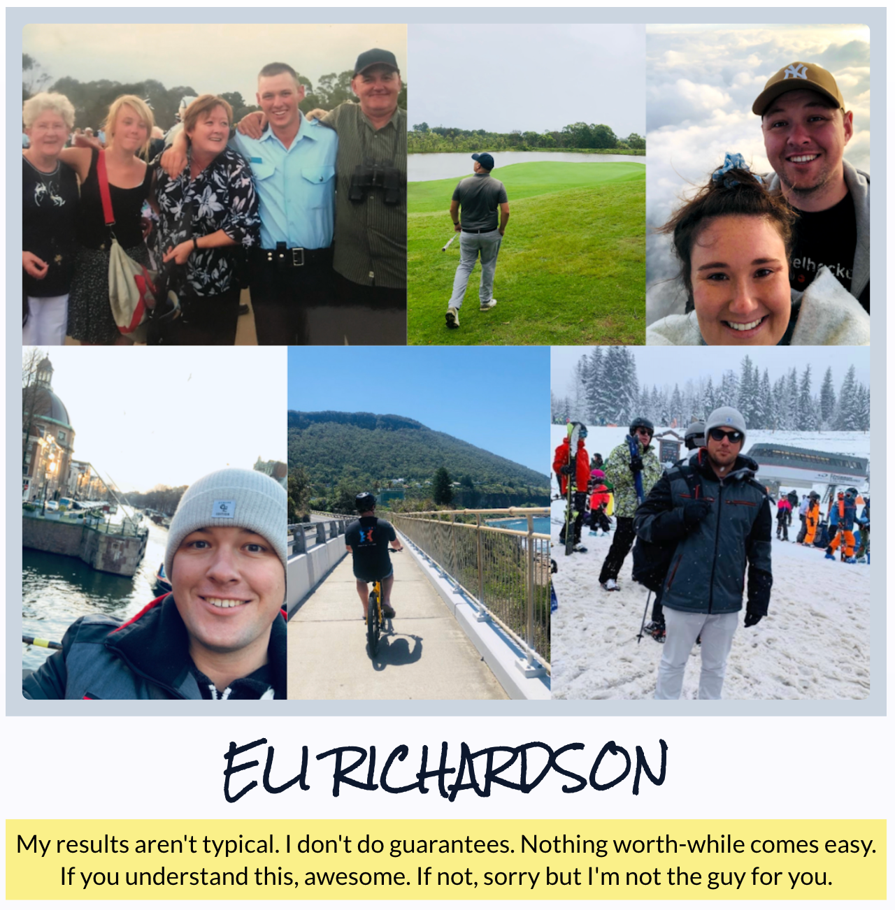 Working with Eli is extremely personalised to your individual situation and he takes a vested interest in your success. It's unbelievable for the amount he's charging - it's a complete steal. The only thing I regret is not reaching out to him sooner!" - Eric S